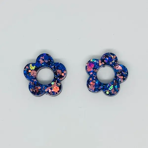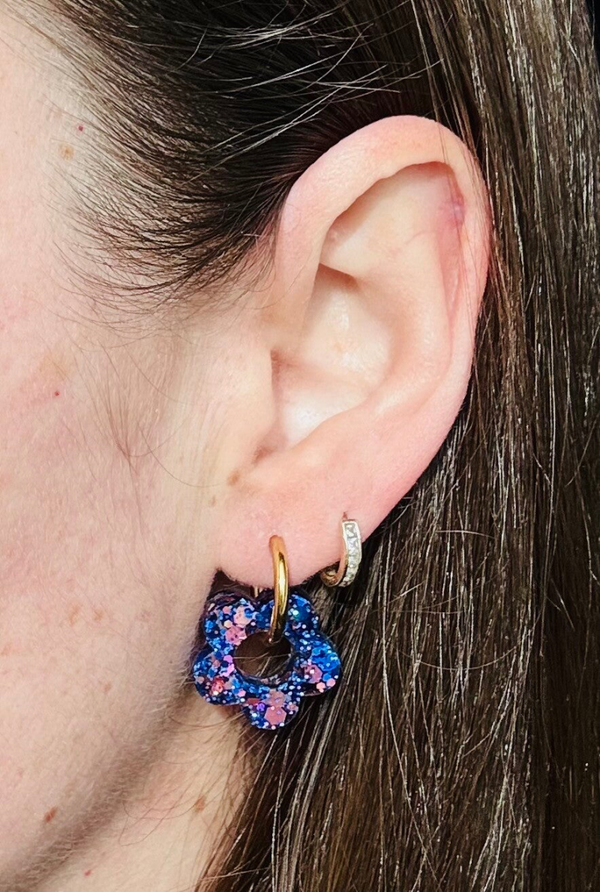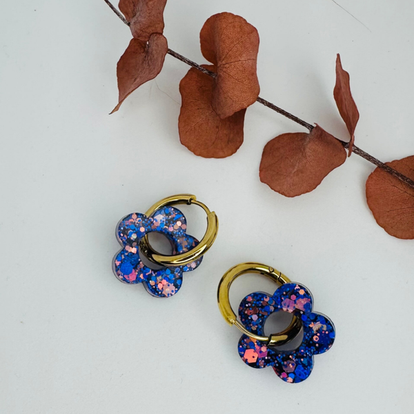 Fait main : Boucles d'oreilles en forme de fleur avec paillettes bleues et roses incrustées !