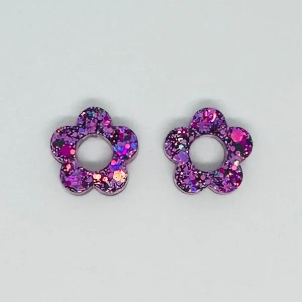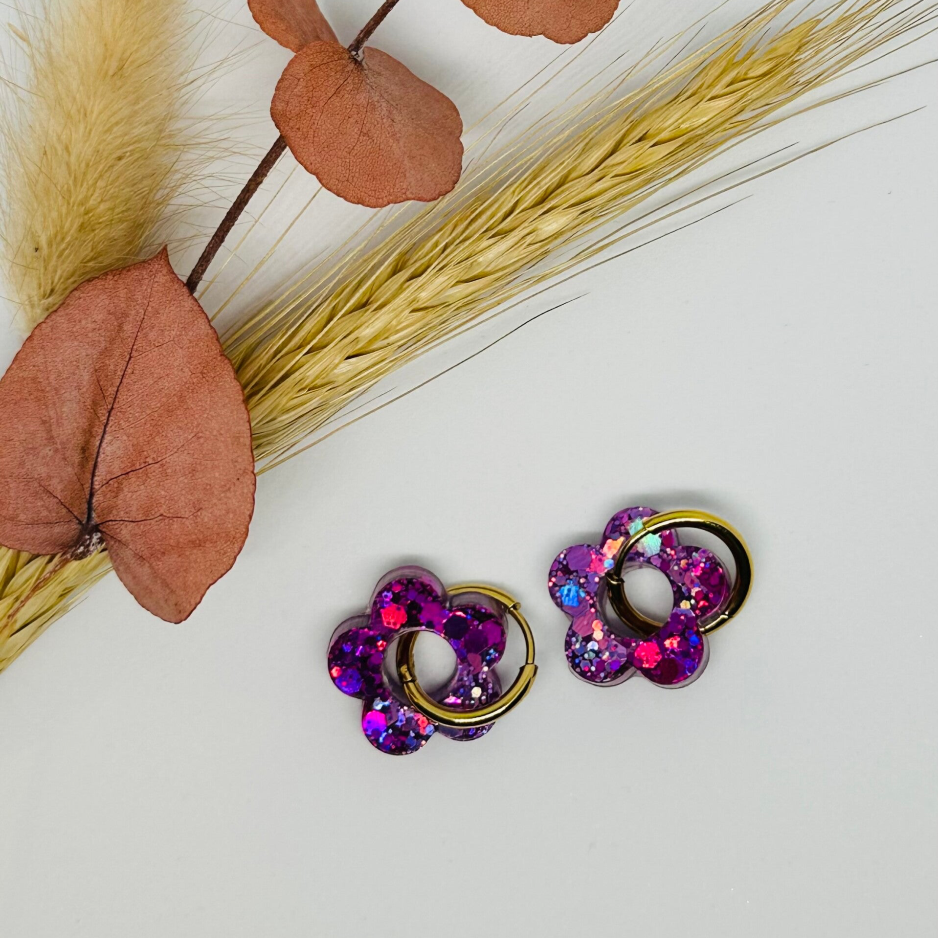 Fait main : Boucles d'oreilles en forme de fleur avec paillettes roses et violettes incrustées !