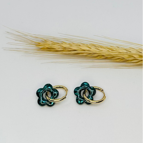 Fait main : Boucles d'oreilles en forme de fleur avec paillettes vertes incrustées !