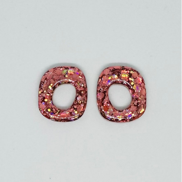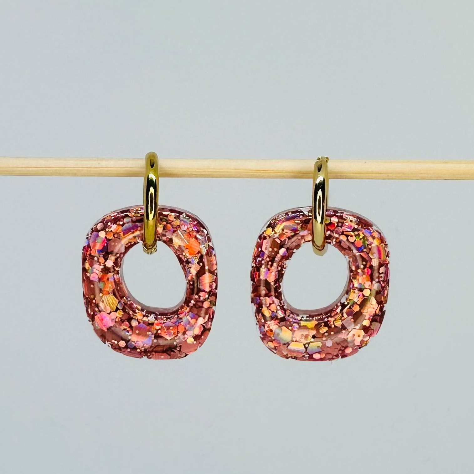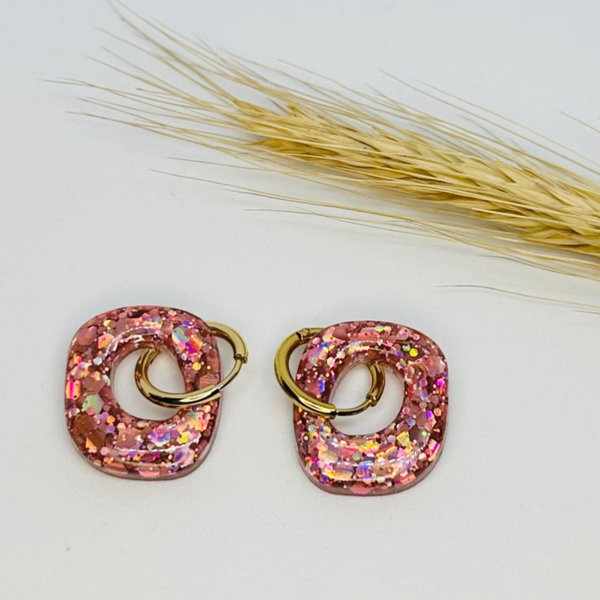Fait main : Boucles d'oreilles en forme de carré déstructuré couleur rose pailletée !