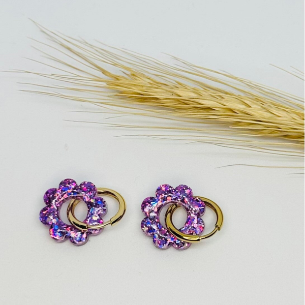 Fait main : Boucles d'oreilles en forme de marguerite couleur violette pailletée !