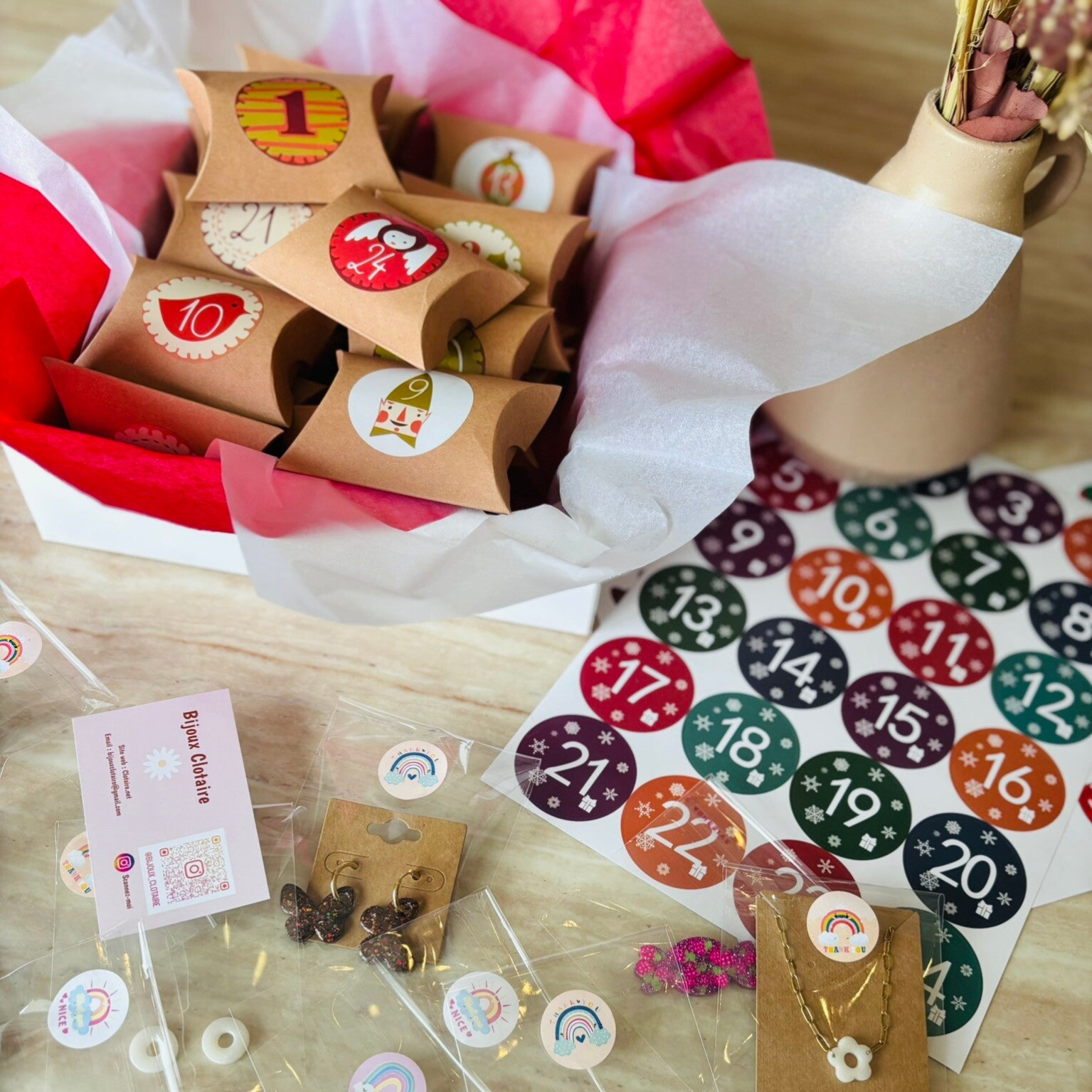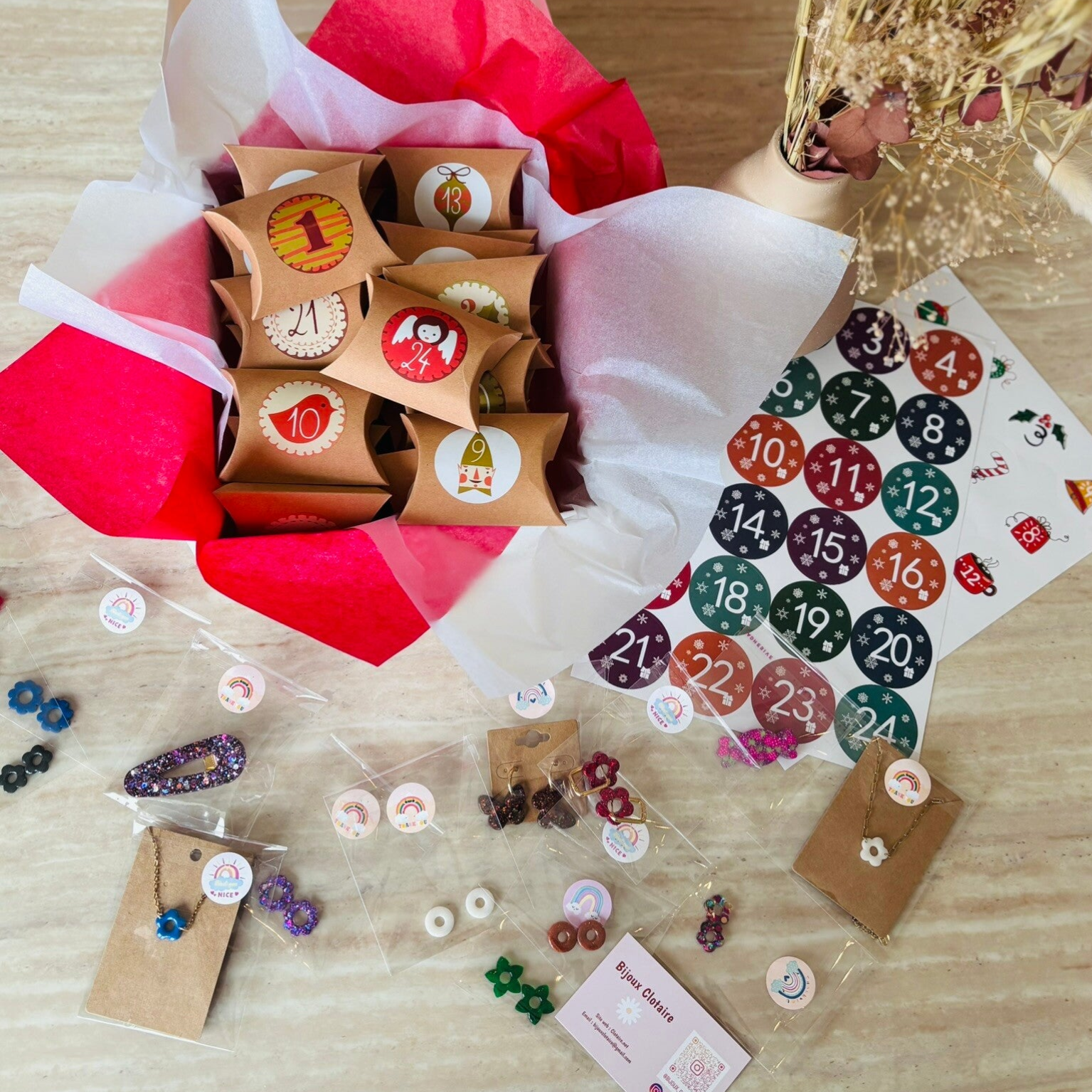 Chaque coffret est unique : les bijoux sont glissés aléatoirement, rendant chaque calendrier différent — il ne sera pas forcément identique à la photo.