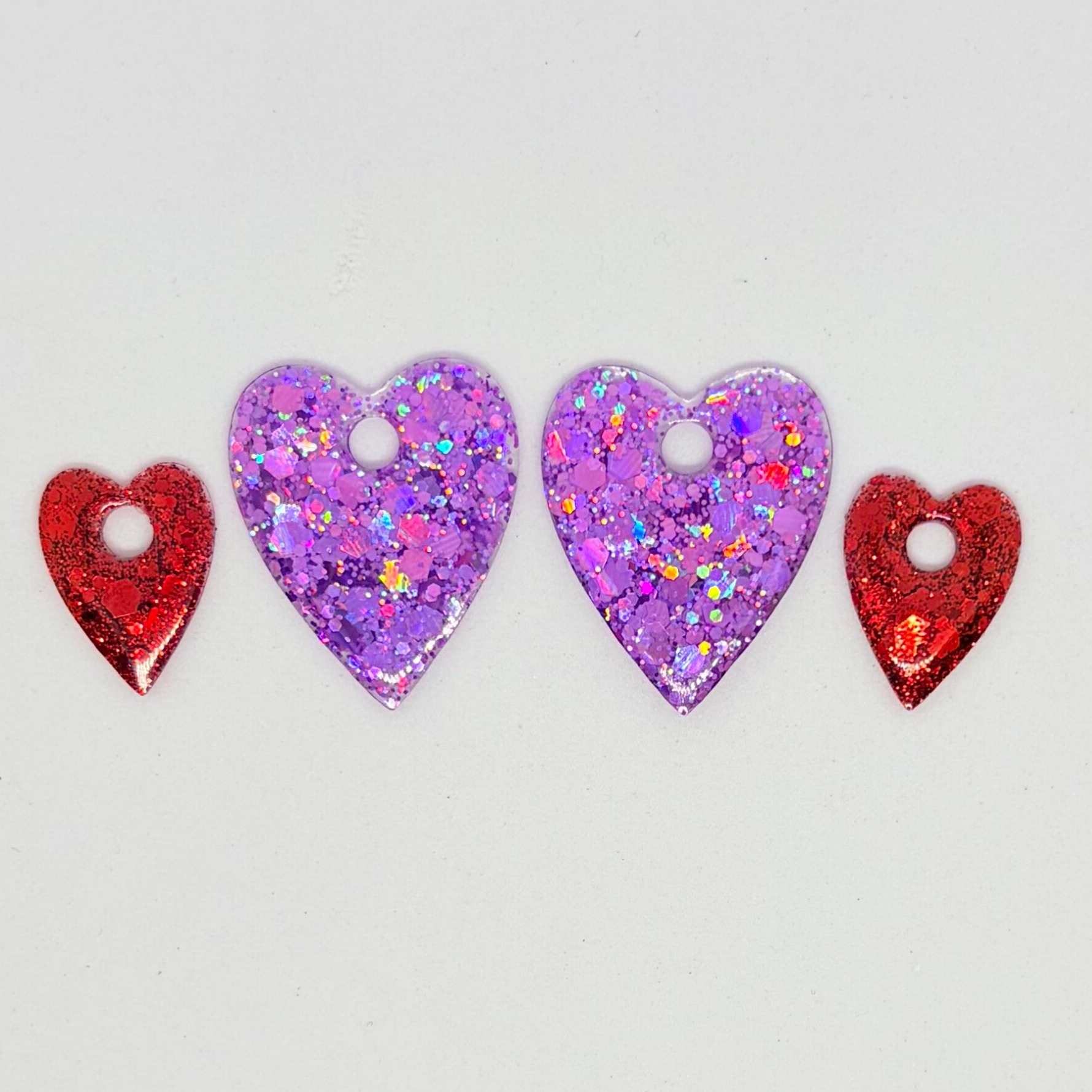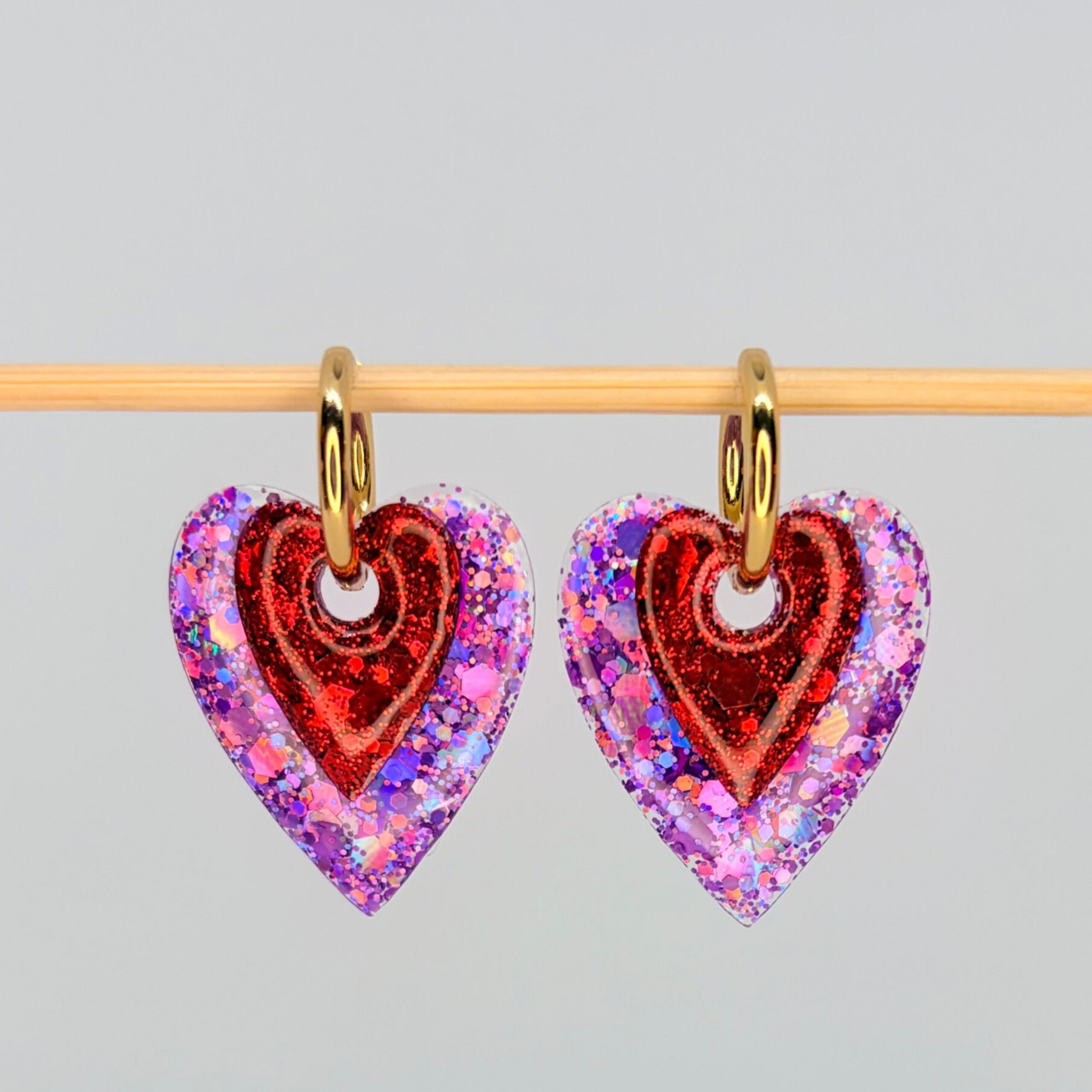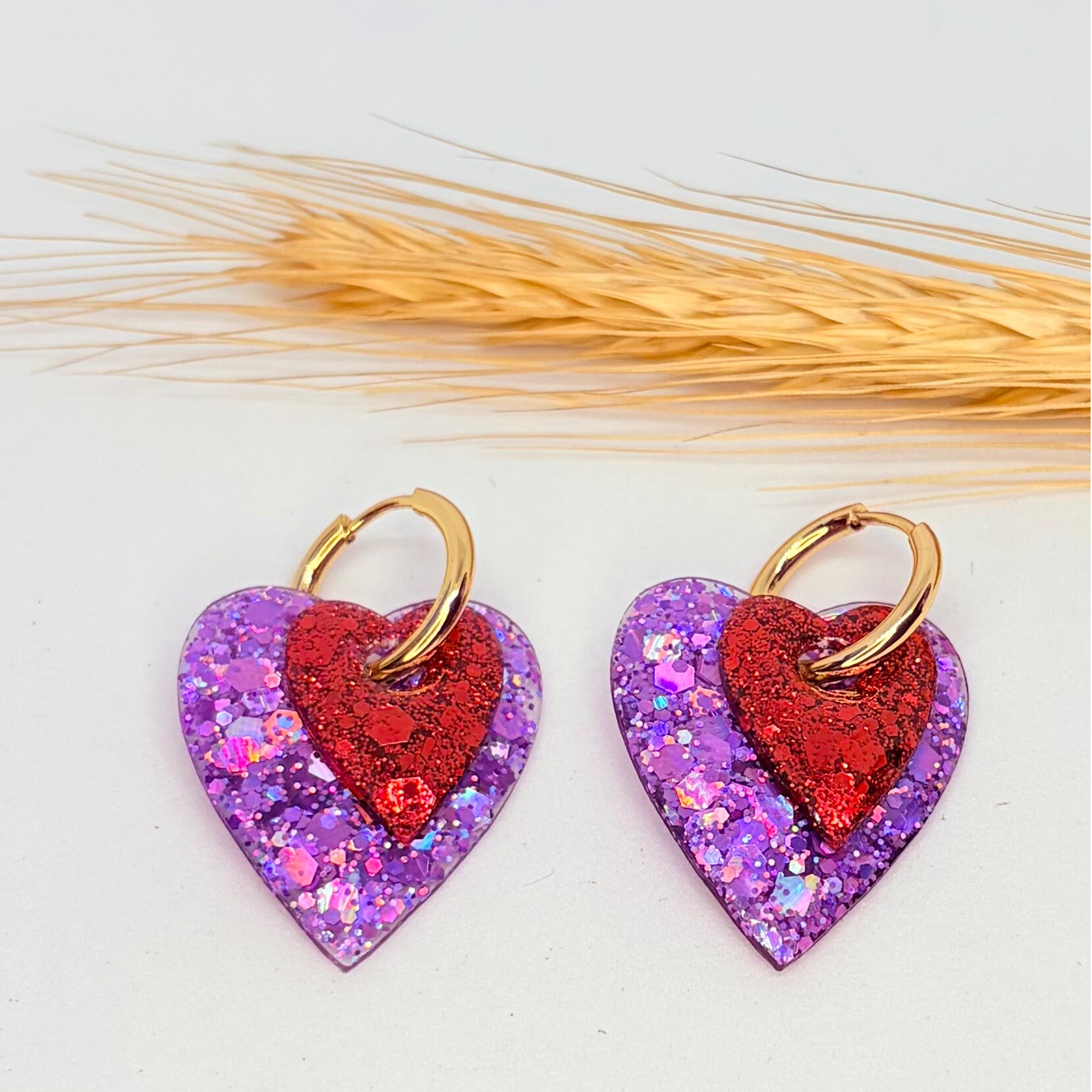 Fait main : Boucles d'oreilles doubles cœurs superposés : violet et rouge pailleté !
