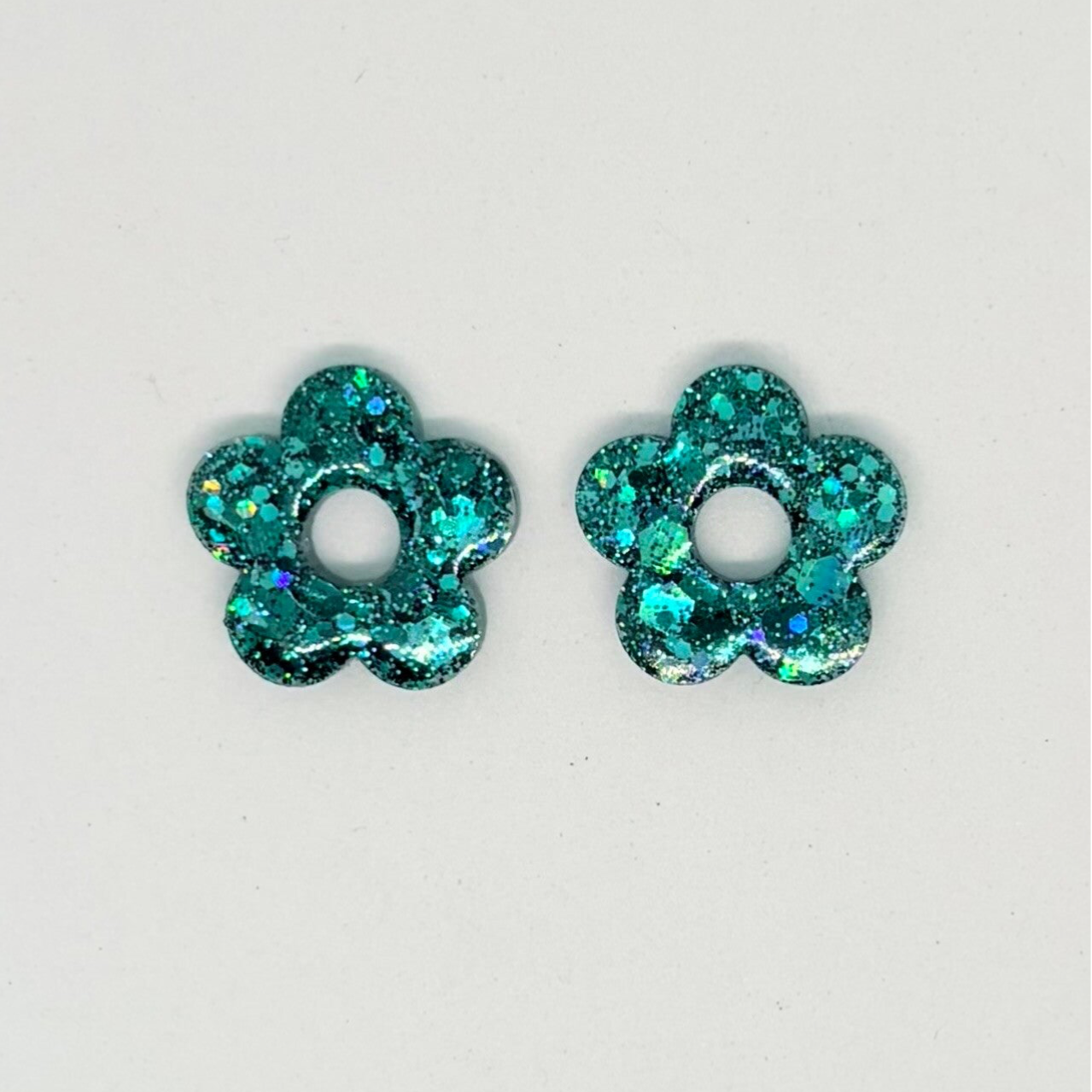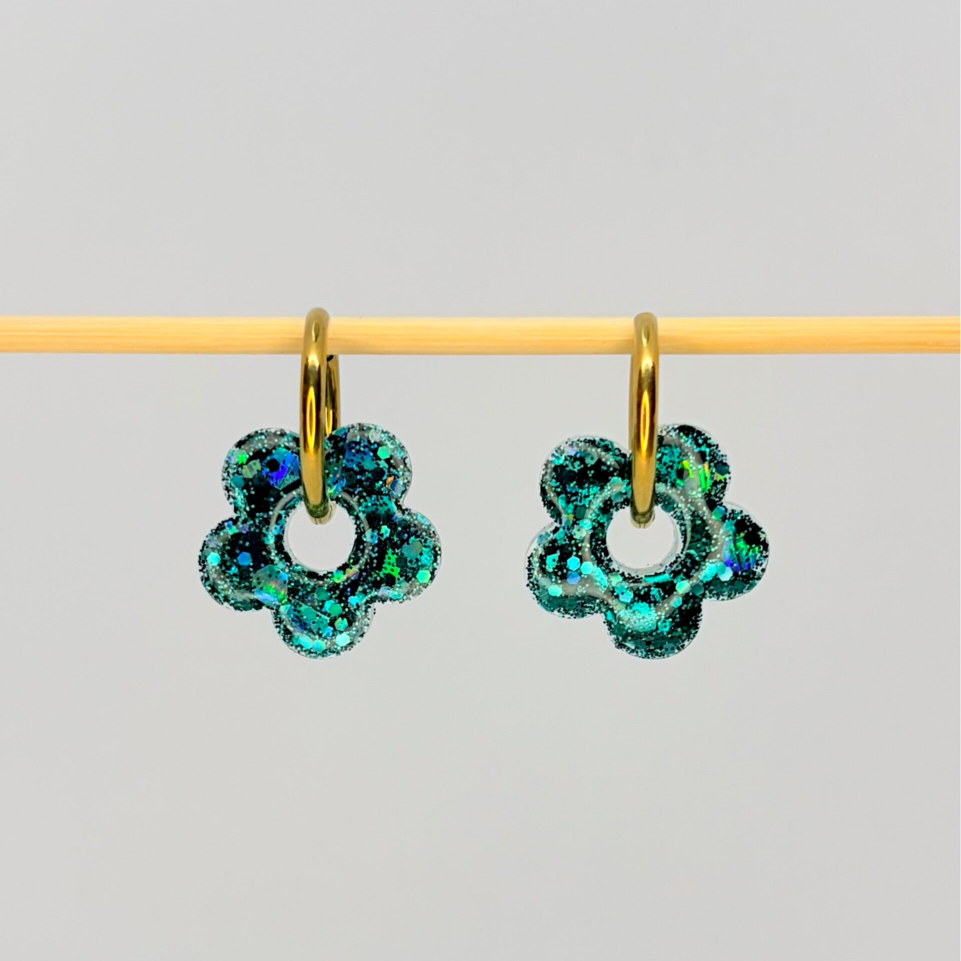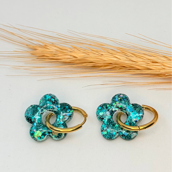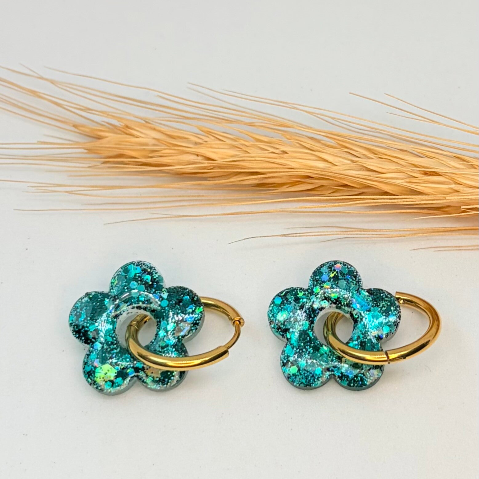 Fait main : Boucles d'oreilles en forme de fleur verte pailletée !