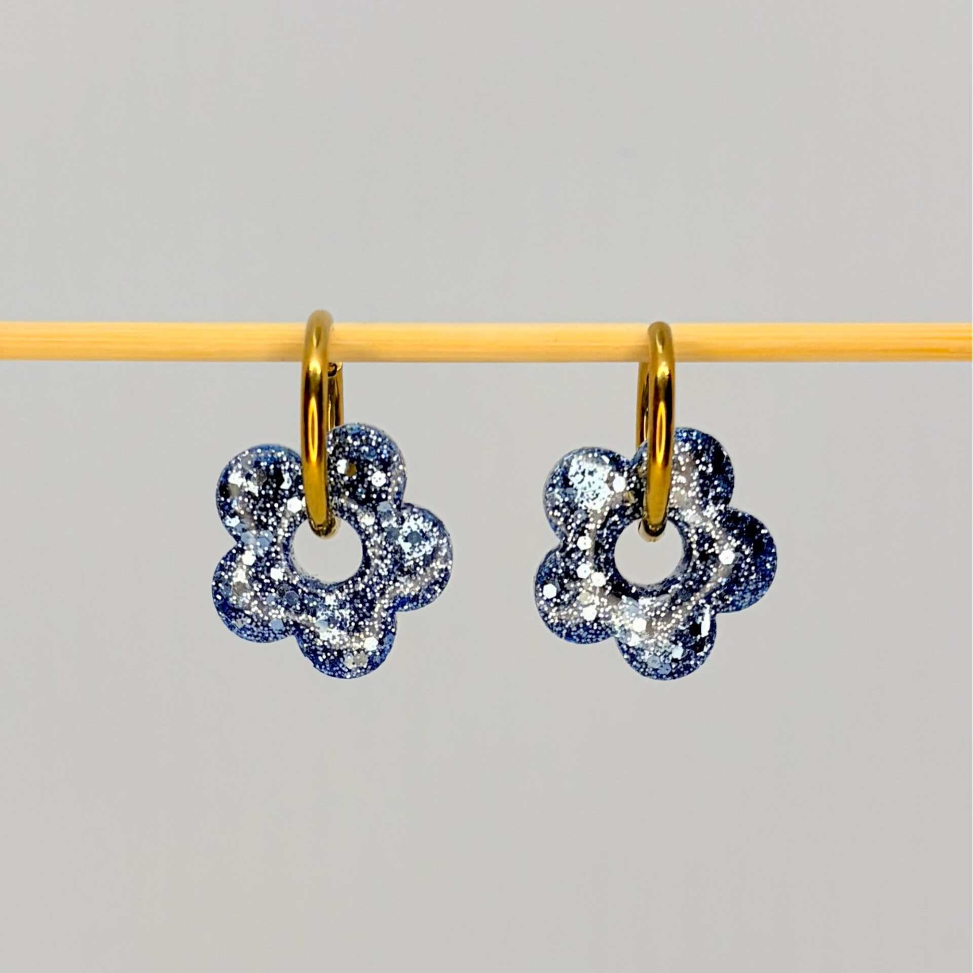 Fait main : Boucles d'oreilles en forme de fleur bleue ciel pailletée !