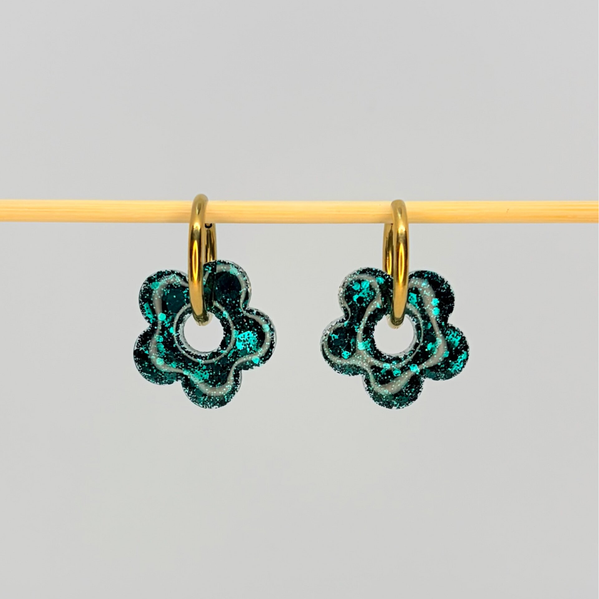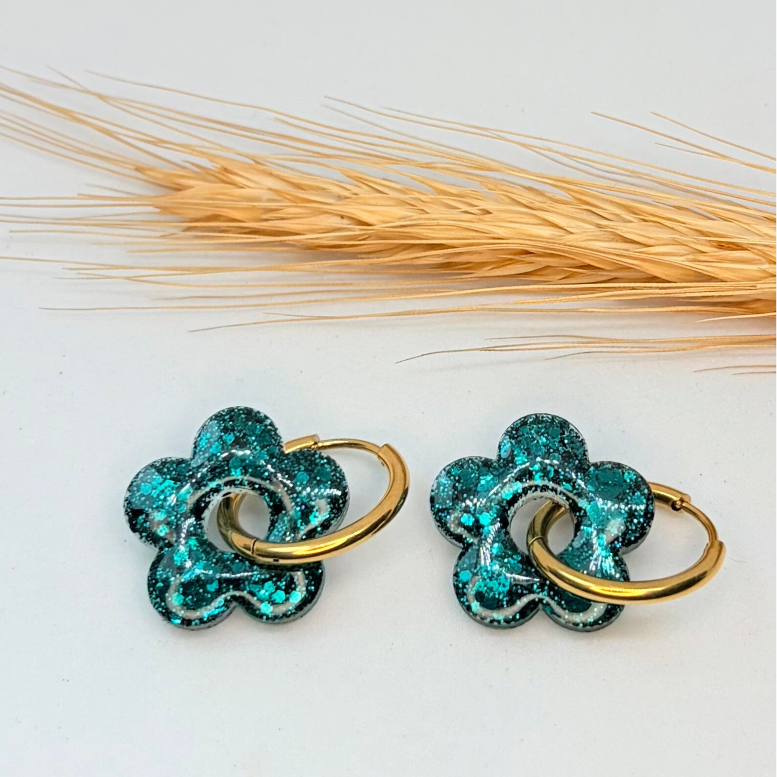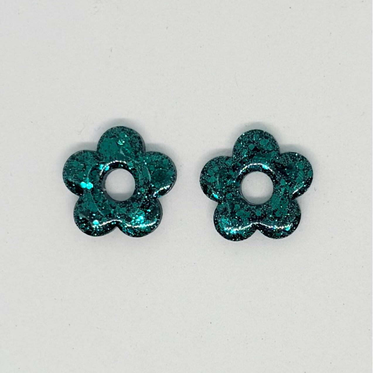 Fait main : Boucles d'oreilles en forme de fleur verte foncée pailletée !